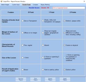 The Swede Score is a new scoring system in colposcopy with score values 0, 1, 2 as the RCI but includes lesion size as the additional variable. It is simple to use, with no major learning curve, can be used easily by any colposcopist. The selected swede score options will be printed in the final report file for future reference.
